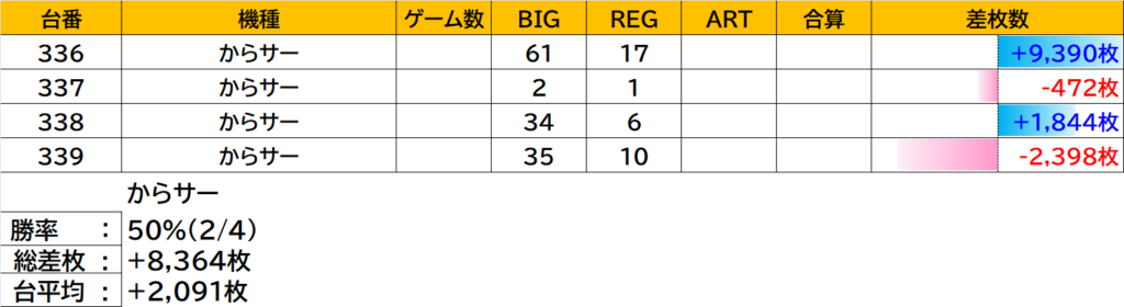 | 取材日 | 総差枚数 | 平均差枚数 | 勝率 |