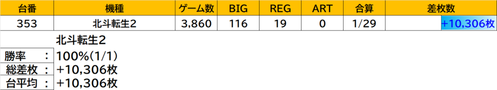 | 1 | 353 | 北斗転生2 | +10,306枚 |