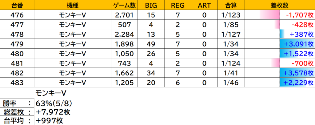 | 7 | 482 | モンキーV | +3,578枚 |