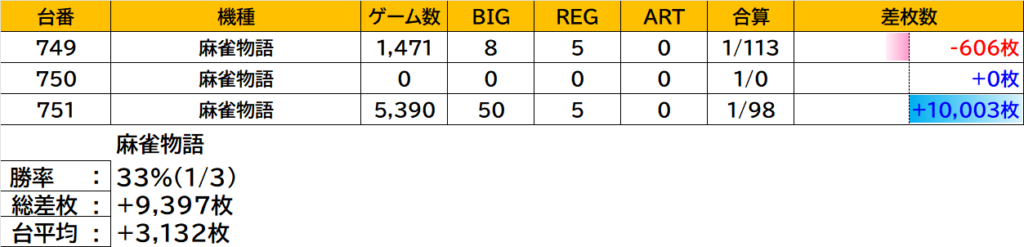 | 1 | 751 | 麻雀物語 | +10,003枚 |