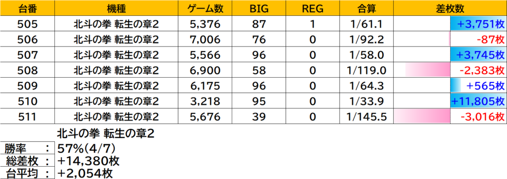 | 2 | 北斗転生2 | 510 | +11,805枚 |