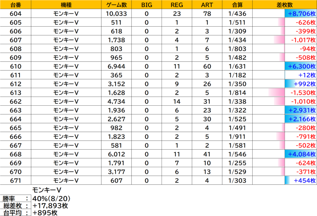 | 7 | モンキーⅤ | 610 | +6,300枚 |