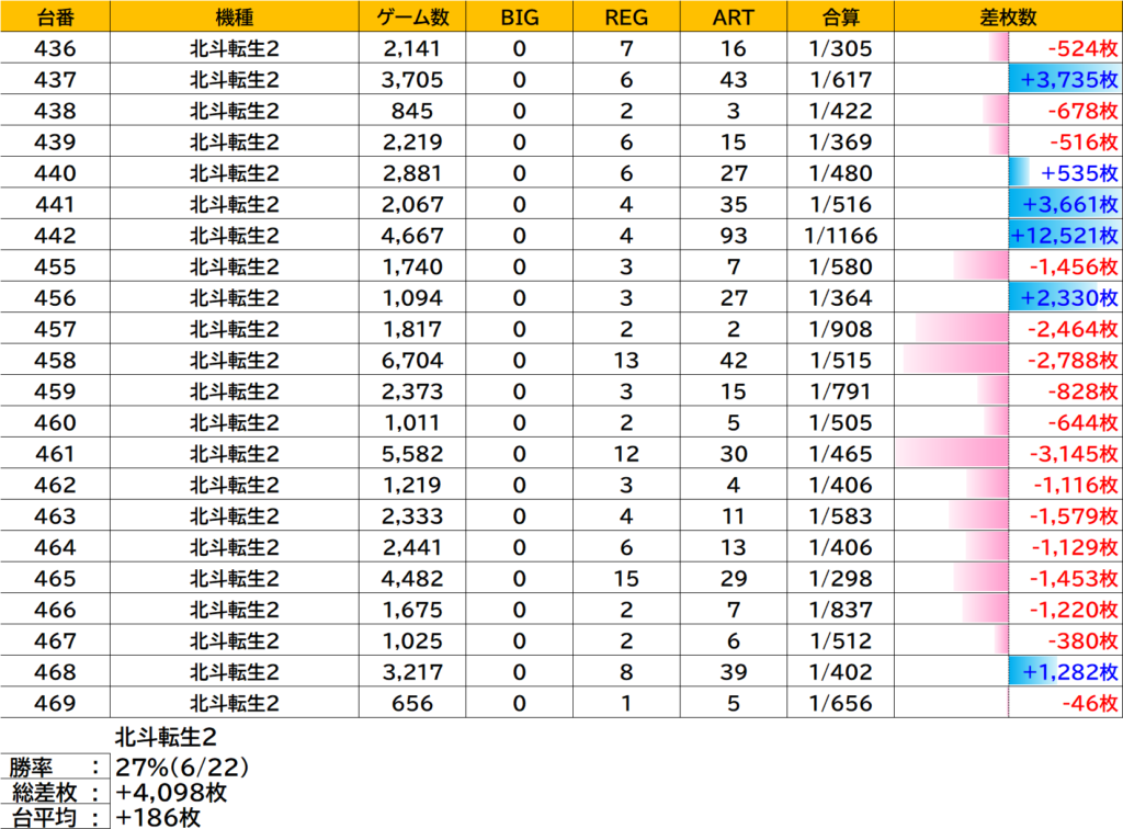 | 1 | 北斗転生2 | 442 | +12,521枚 |
